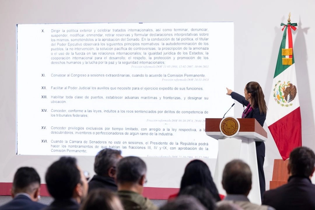 Sobre las declaraciones del presidente de Estados Unidos, Donald Trump, de cambiar de régimen en aquel país, la Presidenta sostuvo que la política exterior mexicana reivindica la soberanía y autodeterminación de los pueblos. Sin abundar más sobre el particular comentó que la producción actual de Pemex es de 1.6 millones de barriles diarios, pero si se suma la producción de la iniciativa privada se alcanzan 1.8 millones de barriles diarios.